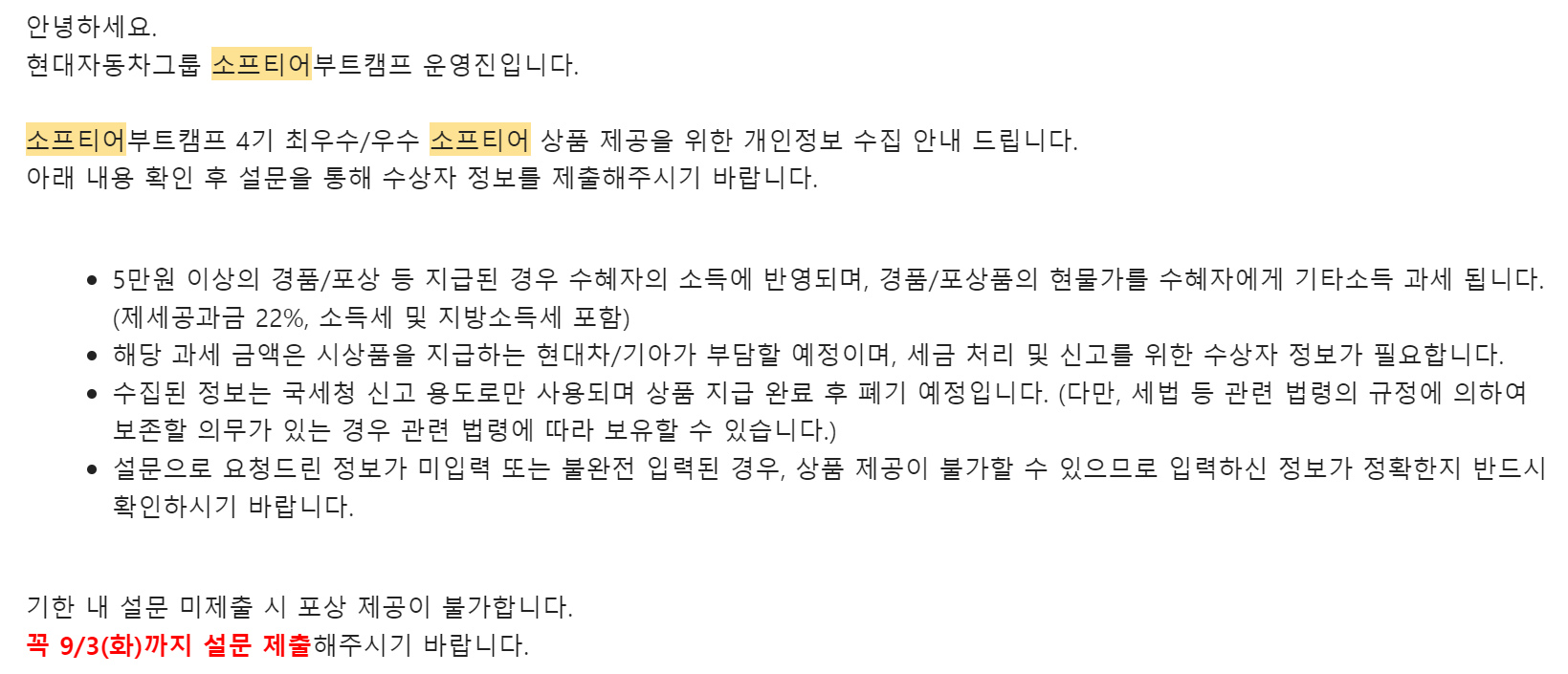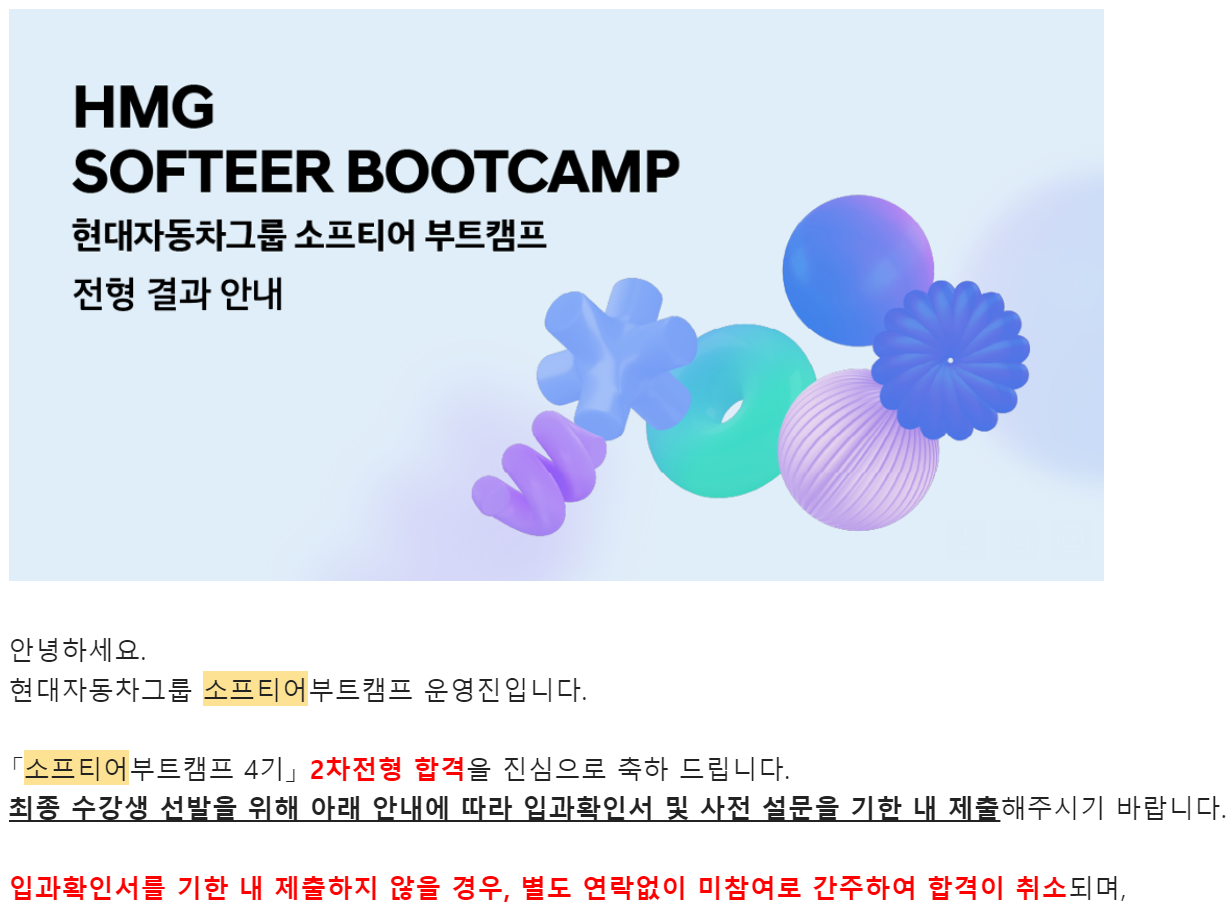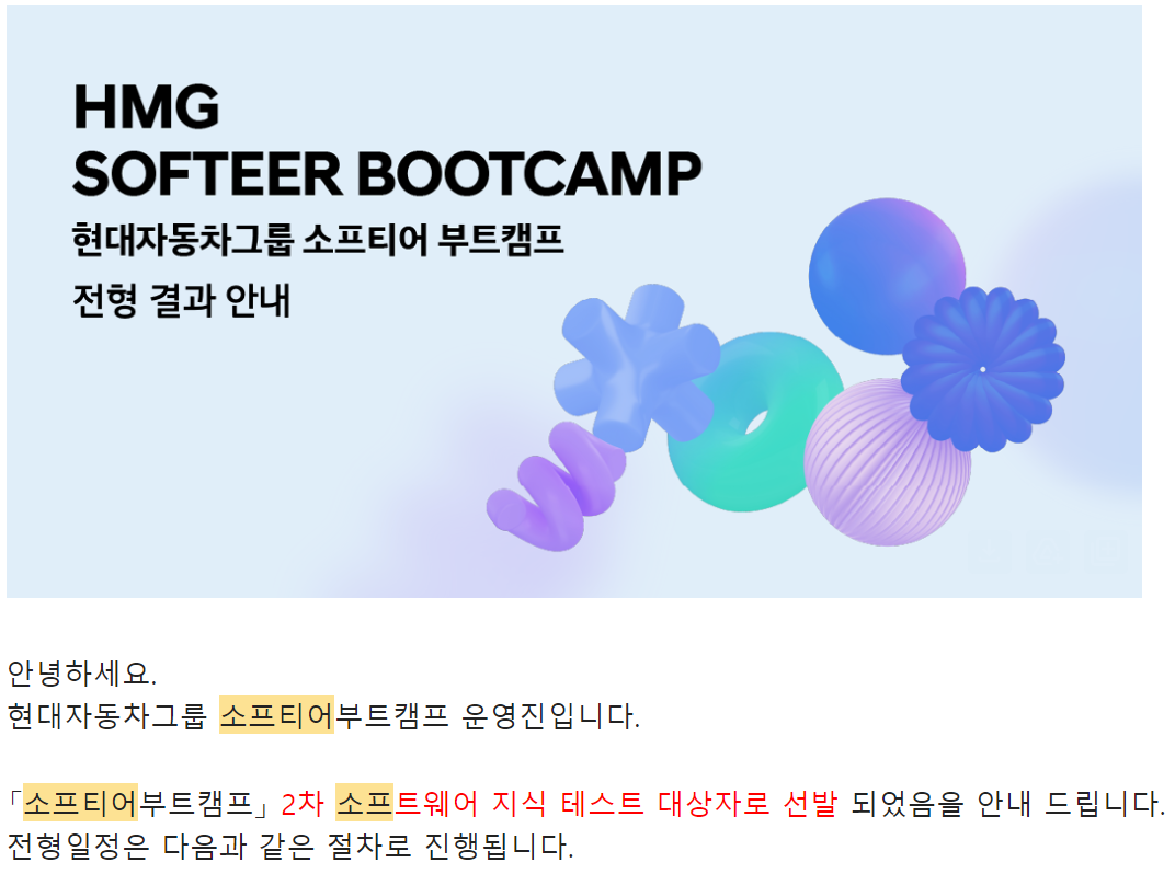 예비군을 하다가 갑자기 이메일을 받게 되었고, 결과적으로 합격할 수 있었다. 상반기 공채를 모두 떨어져서 굉장히 우울한 나날이었는데, 소프티어 부트캠프가 붙어서 행복했었다. 또한, 15명 안에 들었다는 사실에 좀 기분이 좋았다 ㅎㅎ