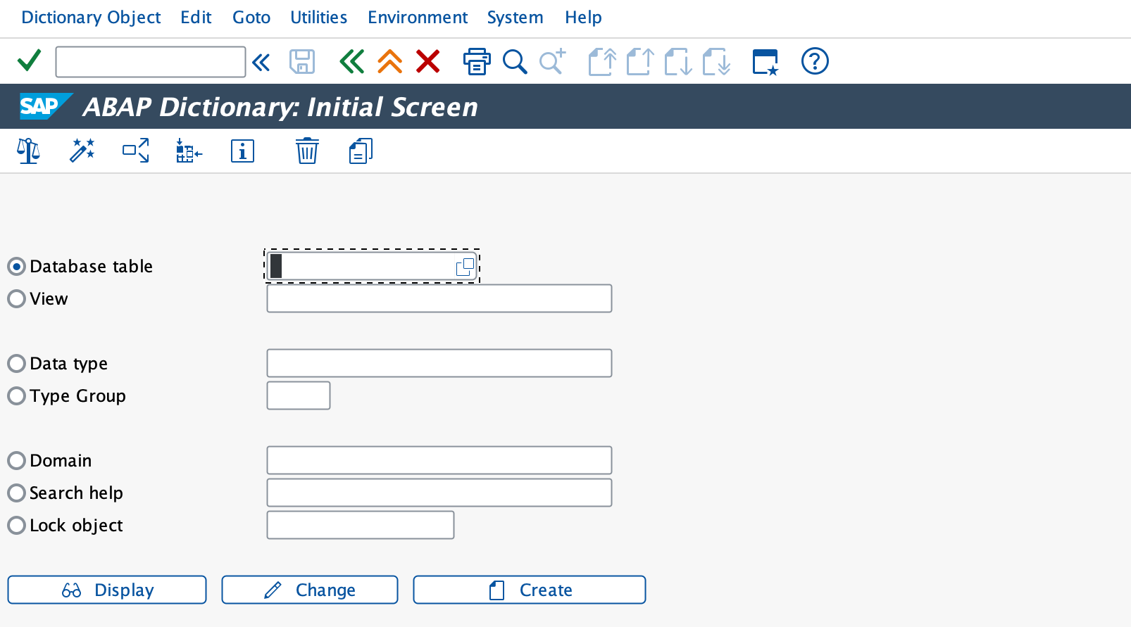 "SE11"을 검색하면, ABAP Dictionary가 나오게 된다. 해당 트랜잭션은 SAP에서 사용되는 데이터 구조 및 속성을 정리하여 관리할 수 있는 부분이다. 즉, 특정 테이블의 스키마를 세부적으로 분석하고 싶을 때 활용할 수 있는 부분이다.