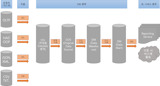Sqoop이란?Apache Sqoop이란 RDBMS (MySQL, Oracle, ...)에서 Apache Hadoop 간 대용량 데이터 전송을 위해 설계된 도구이며, SQL-On-Hadoop의 약자라고 합니다. ETL / ELT 작업을 수행해야하는 상황에서 수집해야 하는 데이터의 크기가 대용량일 경우 Sqoop의 도입은 효율적인 파이프라인을 구성하는 데 고민해볼 수 있습니다. 간단한 예시로 DW (Data WareHouse)를 위한 파이프라인을 구성한다고 가정해보면... 위 그림과 같이, 다양한 형태의 운영계 DB가 존재하는 상황에서 ETL을 통해 STG / ODS / DW / DM을 구성할 수 있습니다. 여기서 STG 영역은 운영계의 데이터를 그대로 복사하여 저장 / 관리를 진행하는 영역이며, 해당..
